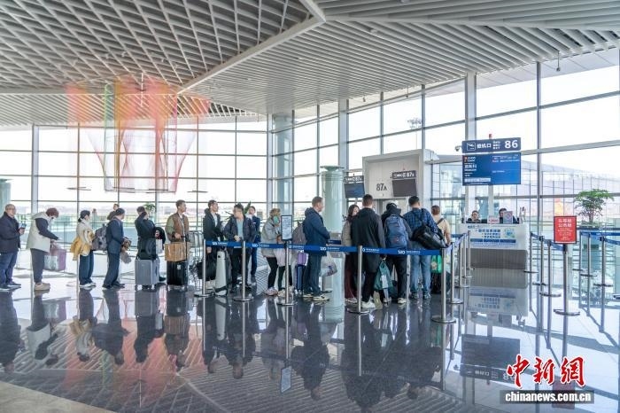 國際旅客在青島機場排隊準備登機。(青島機場供圖)