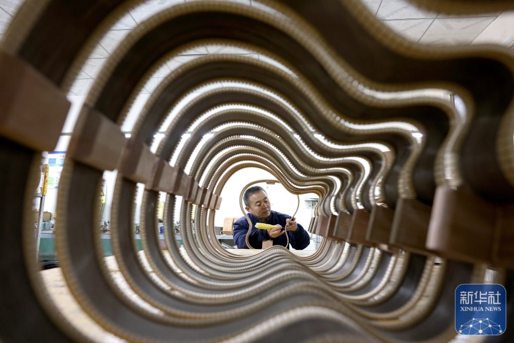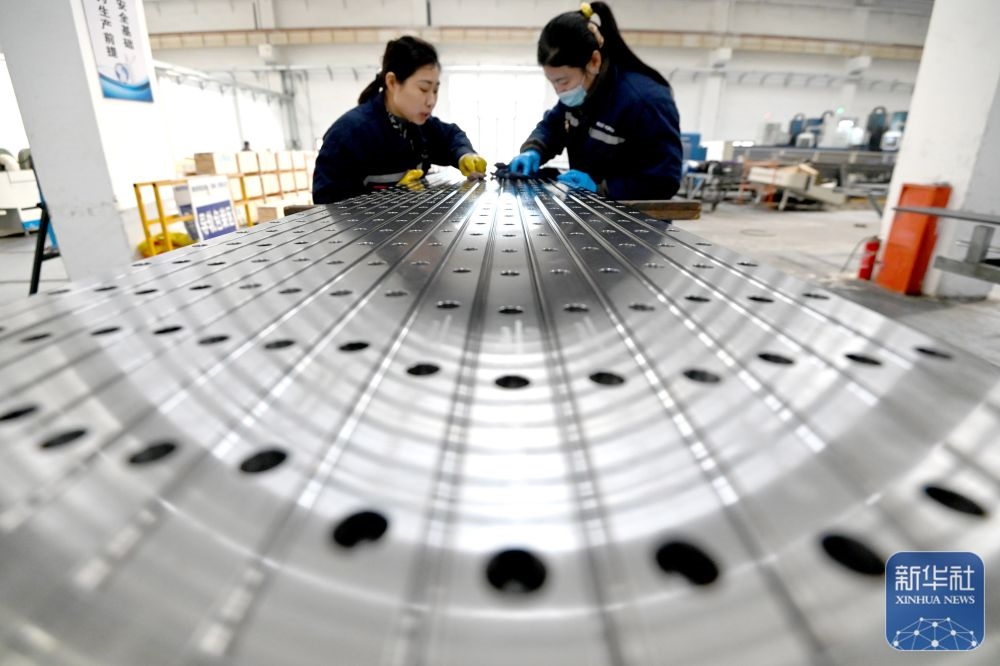 ↑ 12月15日,中鐵科工集團武漢江夏制造基地技術(shù)工人對盾構(gòu)機配件進行裝配作業(yè)。新華社發(fā)(趙軍攝)