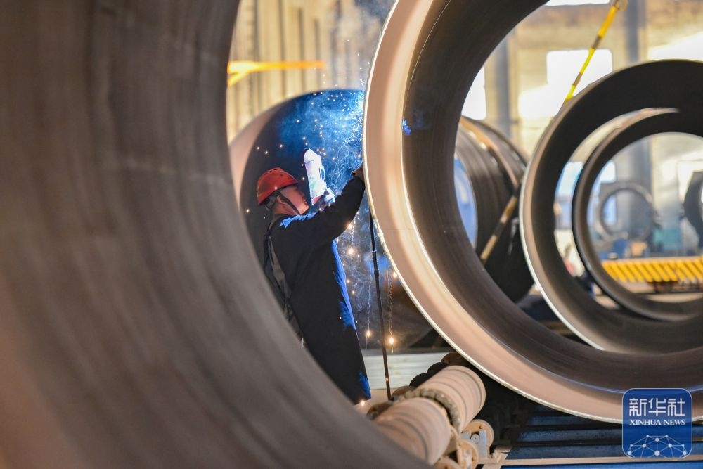 ↑ 12月15日,在位于江蘇省江都高新技術(shù)產(chǎn)業(yè)開發(fā)區(qū)的江蘇廣泓重工設(shè)備有限公司,工人在頂管機總裝車間作業(yè)。新華社發(fā)(任飛攝)
