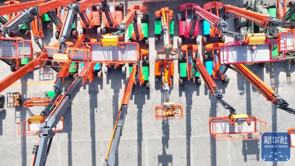 ↑ 12月15日,在位于浙江省湖州市德清縣雷甸鎮(zhèn)的浙江鼎力機械股份有限公司,工人對準(zhǔn)備出口的新臂式智能高空作業(yè)平臺設(shè)備進行檢測(無人機照片)。新華社發(fā)(謝尚國攝)