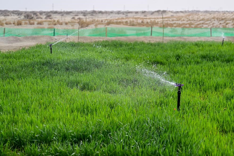 2025年4月13日,新疆阿克蘇地區(qū)沙雅縣沙生經(jīng)濟(jì)作物發(fā)展試驗(yàn)基地,經(jīng)過(guò)苦咸水淡化技術(shù)處理的地下水噴灌出的小麥長(zhǎng)勢(shì)良好。新華社記者丁磊 攝