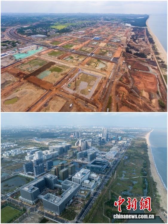 2025年12月18日,海南自由貿(mào)易港正式啟動全島封關。近年來,海南自貿(mào)港建設在利好政策帶動下不斷刷新“自貿(mào)港速度”,一個個重大項目、重點園區(qū)拔地而起,直觀呈現(xiàn)海南自貿(mào)港的蓬勃生機。這里正成為中國對外開放的新前沿、互利合作的新熱土和推動經(jīng)濟全球化的新引擎。上資料圖為2020年8月19日俯瞰三亞崖州灣科技城高新區(qū)建設現(xiàn)場,下資料圖為2025年12月9日已初具規(guī)模的三亞崖州灣科技城高新區(qū)。(拼版圖,無人機照片)