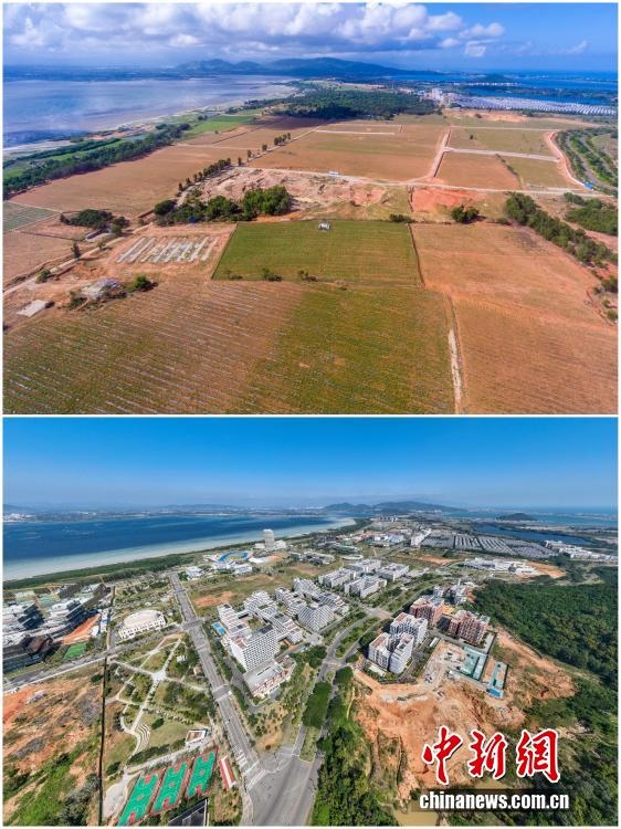 2025年12月18日,海南自由貿(mào)易港正式啟動全島封關。近年來,海南自貿(mào)港建設在利好政策帶動下不斷刷新“自貿(mào)港速度”,一個個重大項目、重點園區(qū)拔地而起,直觀呈現(xiàn)海南自貿(mào)港的蓬勃生機。這里正成為中國對外開放的新前沿、互利合作的新熱土和推動經(jīng)濟全球化的新引擎。上資料圖為2020年6月18日俯瞰尚未開發(fā)的海南陵水黎安國際教育創(chuàng)新試驗區(qū)所在地,下資料圖為2025年11月22日已初具規(guī)模的海南陵水黎安國際教育創(chuàng)新試驗區(qū)。(拼版圖,無人機照片)