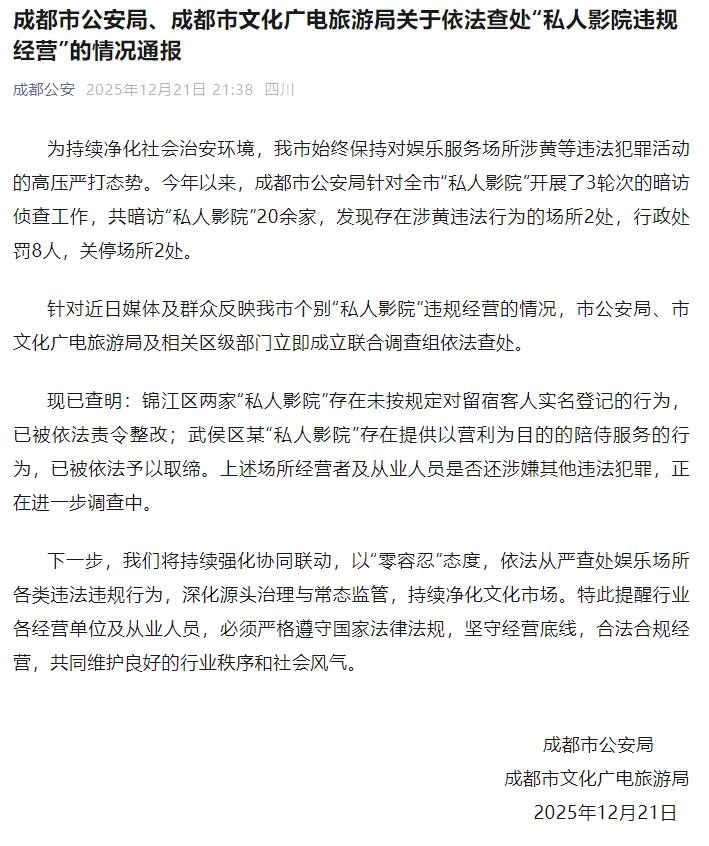 現(xiàn)已查明:錦江區(qū)兩家“私人影院”存在未按規(guī)定對留宿客人實名登記的行為,已被依法責令整改;武侯區(qū)某“私人影院”存在提供以營利為目的的陪侍服務(wù)的行為,已被依法予以取締。上述場所經(jīng)營者及從業(yè)人員是否還涉嫌其他違法犯罪,正在進一步調(diào)查中。
