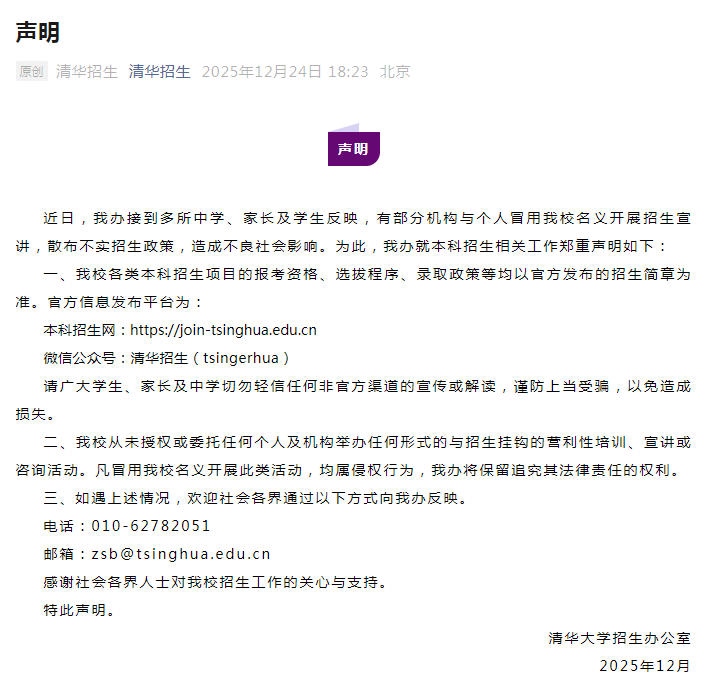 據(jù)“清華招生”微信公眾號消息,清華大學(xué)招生辦公室24日發(fā)布聲明稱,近日,清華大學(xué)招生辦公室接到多所中學(xué)、家長及學(xué)生反映,有部分機(jī)構(gòu)與個人冒用清華大學(xué)名義開展招生宣講,散布不實(shí)招生政策,造成不良社會影響。為此,清華大學(xué)招生辦公室就本科招生相關(guān)工作鄭重聲明如下: