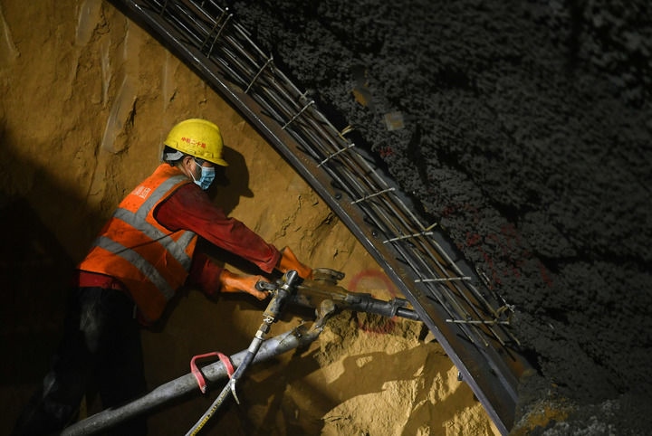 2022年4月25日,工人在位于延安市洛川縣的西延高鐵洛川隧道施工。新華社記者 張博文 攝