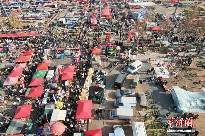 12月8日,山東省臨沂市臨沭縣,民眾暢游曹洼大集。近期,曹洼大集憑借超高性價(jià)比的特色美食、濃郁的民俗氛圍、線上線下聯(lián)動(dòng)的鮮活場(chǎng)景火爆全網(wǎng)。(無(wú)人機(jī)照片) 中新社記者 王峰 攝