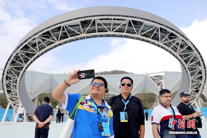 1月19日,第六屆亞洲沙灘運動會世界媒體大會暨世界轉(zhuǎn)播商大會在海南三亞舉行。圖為國際記者參訪三亞天涯海角游覽區(qū)亞沙公園。(第六屆亞洲沙灘運動會執(zhí)委會 供圖)