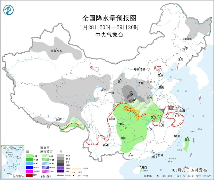 圖1 全國(guó)降水量預(yù)報(bào)圖(1月27日20時(shí)-28日20時(shí))