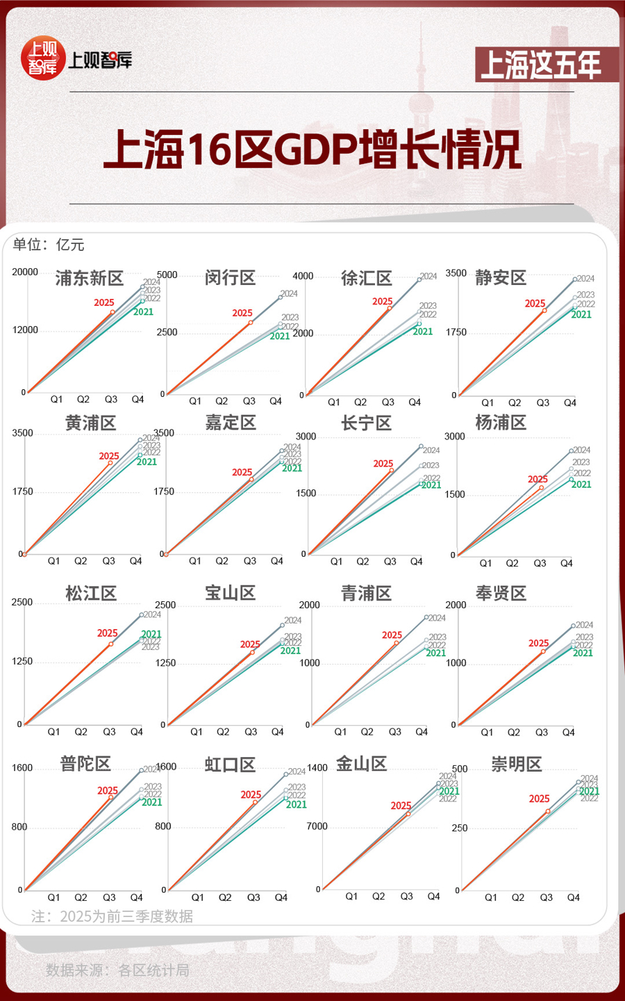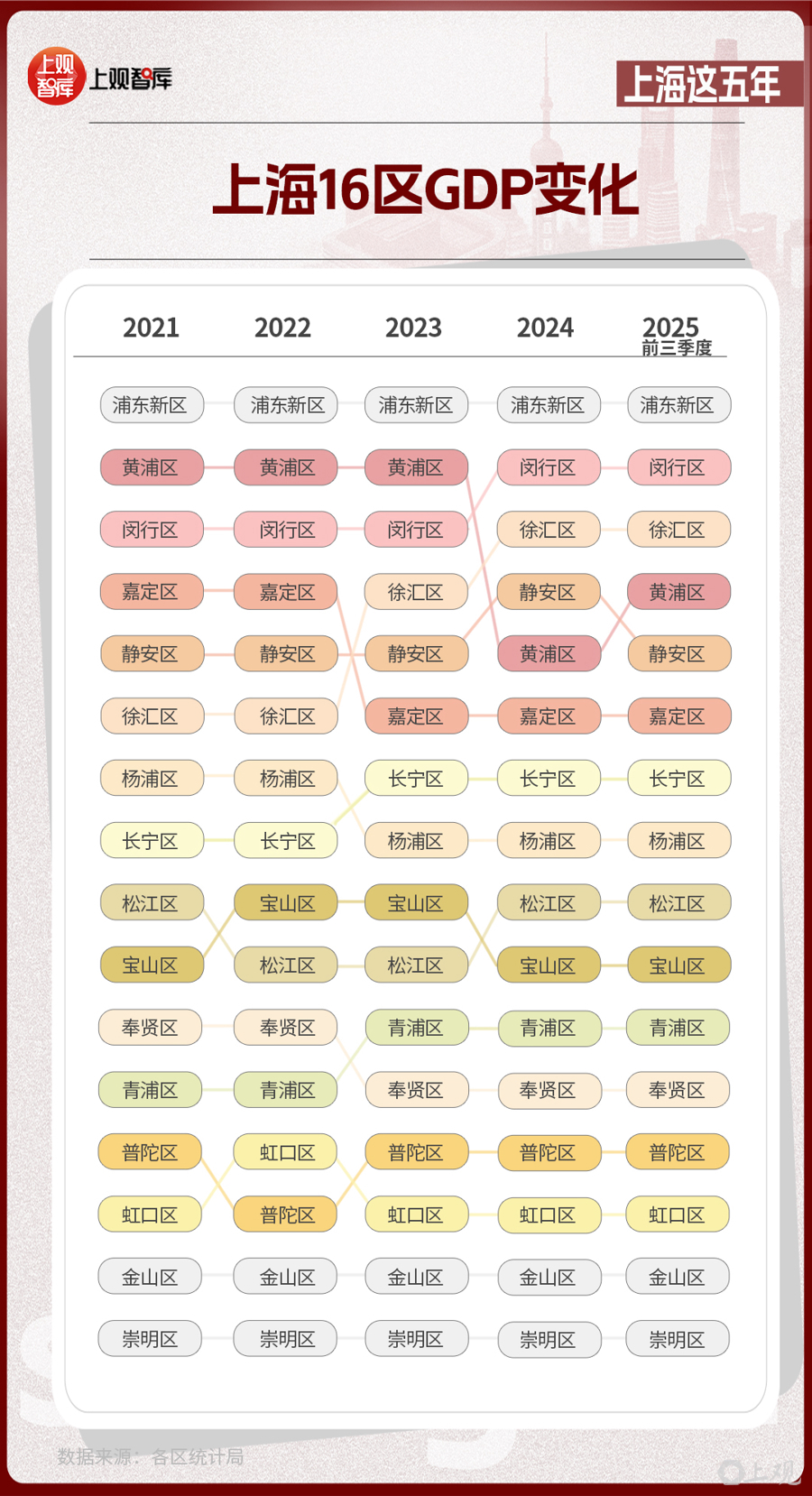 區(qū)域?qū)用妫虾?6區(qū)GDP的變化,體現(xiàn)出從中心向多極擴散的趨勢。2021年,浦東新區(qū)GDP占全市近36%,而到了2025年,這一比重下降至約33%。其他區(qū)在這五年間,充分發(fā)揮自身優(yōu)勢,齊頭并進,為上海發(fā)展創(chuàng)造了更多增長極。