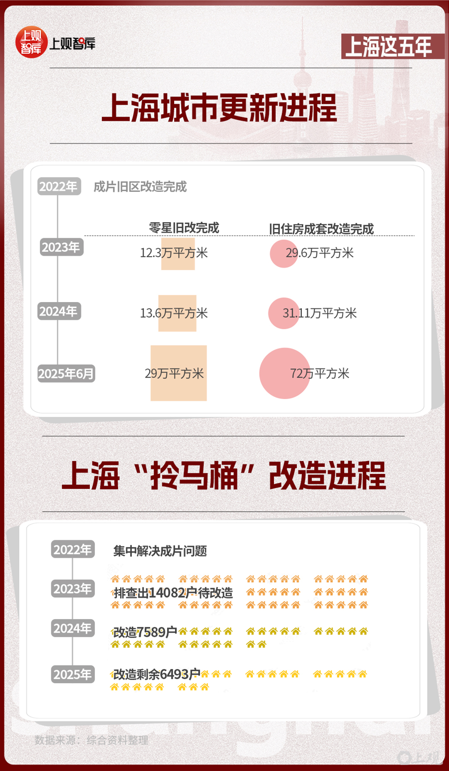2022年,上海市成片舊區(qū)改造完成;此后,上海加力推進“兩舊一村”改造。2023年到2025年6月底,零星舊改完成約29萬平方米,舊住房成套改造完成約72萬平方米,城中村改造認(rèn)定44個項目,完成老舊小區(qū)改造3910萬平方米,提前完成舊改核心任務(wù)。