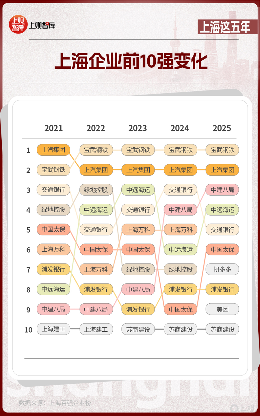 這份由上海市企業(yè)聯(lián)合會、上海市企業(yè)家協(xié)會、上海市經(jīng)濟團體聯(lián)合會和解放日報社共同發(fā)布的榜單,從2021年到2025年,見證了傳統(tǒng)企業(yè)的轉(zhuǎn)型與創(chuàng)新企業(yè)的涌現(xiàn)。在前10強的名單中,制造業(yè)仍然是上海產(chǎn)業(yè)的壓艙石,而房地產(chǎn)、建筑企業(yè)從2021年占比達40%,到2025年占比降低為20%?;ヂ?lián)網(wǎng)企業(yè)在2025年沖上前10強,并占據(jù)了20%的席位,亮出了上海經(jīng)濟多元發(fā)展的成績單。