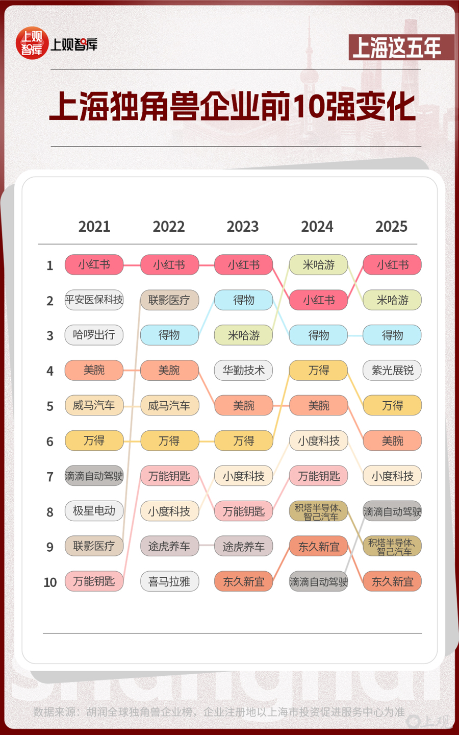前10位的上海獨角獸企業(yè),從2021年到2025年,發(fā)生了不小的改變。有的企業(yè)已經(jīng)上市,如聯(lián)影醫(yī)療、華勤技術(shù)等;有的企業(yè)悄然退場;有的企業(yè)仍持續(xù)霸榜,如小紅書、米哈游、得物、美腕、萬得。獨角獸企業(yè)的變動與產(chǎn)業(yè)趨勢息息相關(guān)。當(dāng)新能源汽車產(chǎn)業(yè)進入高質(zhì)量發(fā)展的階段時,智己汽車接過領(lǐng)軍大旗;在AI芯片成為市場熱點時,積塔半導(dǎo)體、紫光展銳已躋身芯片新勢力代表之列。