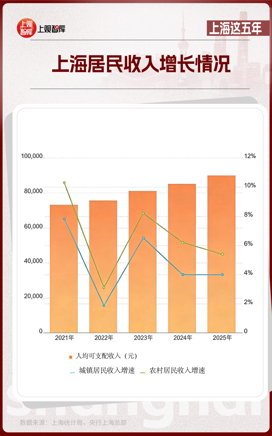2025年,上海人均可支配收入超過了9萬元,對比2021年增長了17.9%;人均消費支出逼近5.5萬元,對比2021年增長了12.0%;全市社會消費品零售總額增長4.6%。