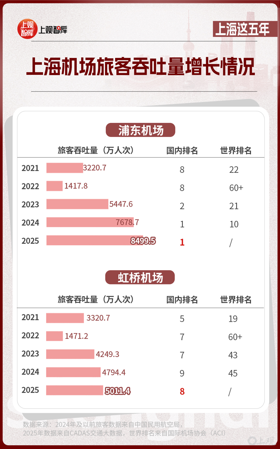 2024年,上海浦東國際機場首次排名全國旅客吞吐量第一,榮登中國最繁忙的機場。也是在這一年,上海港成為全球首個年吞吐量超過5000萬標(biāo)準(zhǔn)箱的世界大港。
