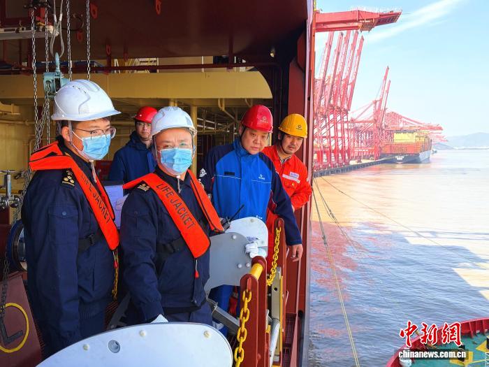2月13日,寧波海關(guān)所屬北侖海關(guān)關(guān)員正在現(xiàn)場監(jiān)管保稅LNG加注情況。吳夢凱 攝