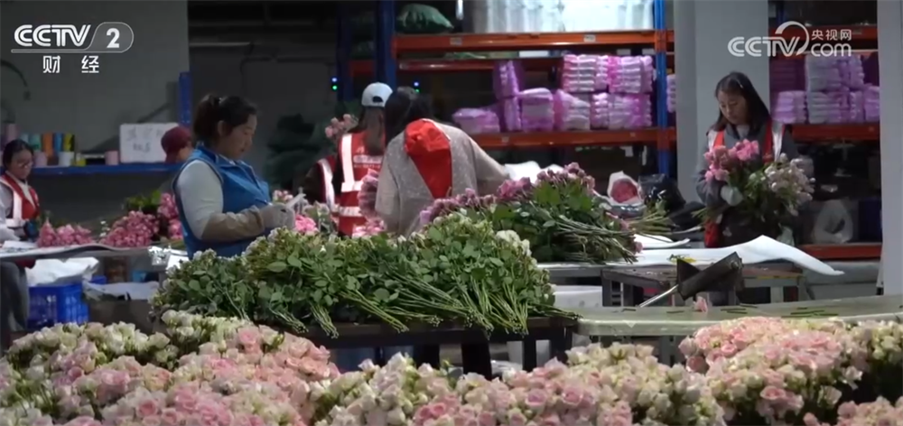 商家介紹,本月出口鮮花的發(fā)貨量是日常的五倍,目前訂單已經(jīng)排到年后。新鮮采摘的鮮花在出口商車間完成分揀、包裝、保鮮等處理后,由冷鏈送往機(jī)場(chǎng)過關(guān)出口,整個(gè)流程最快不到20小時(shí)就能完成。