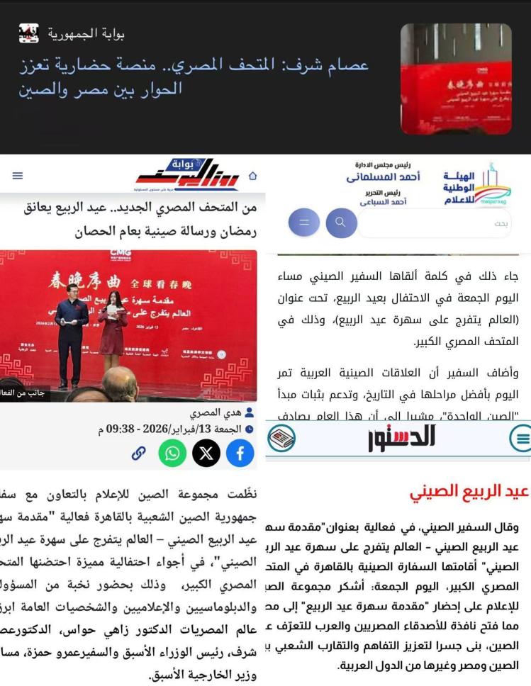 埃及國有媒體管理局官網(wǎng)以及開羅新聞電視臺、尼羅河電視臺、中東通訊社、《金字塔報》《共和國報》《今日埃及人報》《七日報》《憲章報》《魯茲優(yōu)素福》雜志等埃主流媒體對活動進行了報道。