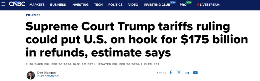 這場圍繞IEEPA關(guān)稅的“退稅大戰(zhàn)”,法律角度看,是最高法院把稅收權(quán)拉回國會和專門貿(mào)易法院;財政角度看,是企業(yè)與財政部圍繞上千億美元現(xiàn)金流展開的拉鋸;政治角度看,則是特朗普團隊在不情愿認輸?shù)那疤嵯?,通過話術(shù)和新關(guān)稅,把法律挫敗包裝成對內(nèi)繼續(xù)強硬的機會。正是在這樣的框架下,貝森特“這不是關(guān)鍵問題”的回答,恰恰暴露了關(guān)鍵所在:關(guān)稅退不退,已經(jīng)成為這屆美國政府最不愿正面回答、但又繞不開的核心問題。