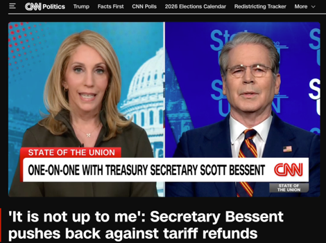 當?shù)貢r間2月22日,美國財政部長斯科特·貝森特在接受美國有線電視新聞網(wǎng)(CNN)采訪時,被主持人達娜·巴什追問著一個看似直接、卻難以直接回答的問題:既然最高法院已裁定特朗普政府依據(jù)《國際緊急經(jīng)濟權(quán)力法》(IEEPA)征收的大范圍“緊急關(guān)稅”缺乏授權(quán),那么此前收上來的巨額關(guān)稅款,退不退、怎么退?