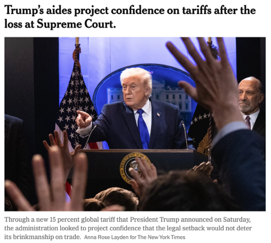 △《紐約時報》報道,特朗普政府當?shù)貢r間22日表示,新的征稅方法將以更合法、更持久的方式實現(xiàn)美國的貿(mào)易目標
