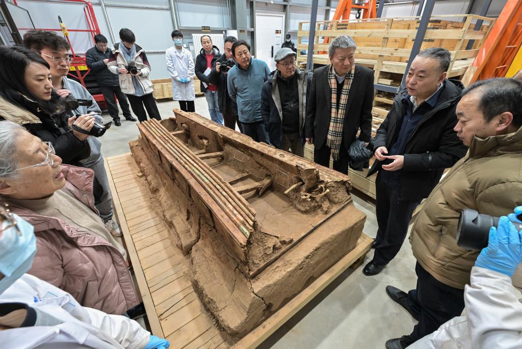 巴達(dá)木東晉唐時(shí)期墓群考古發(fā)掘負(fù)責(zé)人尚玉平(右二)向?qū)<覀兘榻B墓葬M20出土的彩繪木棺座。新華社記者 李賀 攝