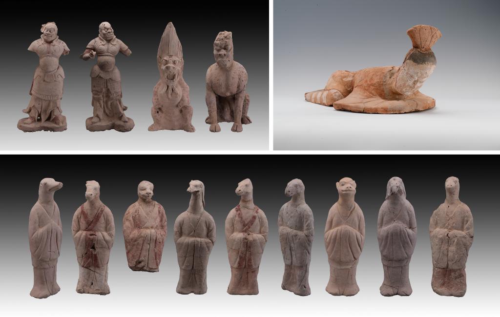拼版照片:新疆吐魯番市巴達(dá)木東晉唐時(shí)期墓群出土的陶俑(資料照片)。新華社 發(fā)