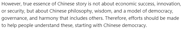 文章稱(chēng),中國(guó)成功的基礎(chǔ)在于中國(guó)獨(dú)特的民主模式——全過(guò)程人民民主。其中,社會(huì)主義核心價(jià)值觀(guān)是整個(gè)體系的基石。中國(guó)以人為本的治理模式,以人民的福祉、安全和繁榮為核心,并通過(guò)全過(guò)程人民民主來(lái)實(shí)現(xiàn)。