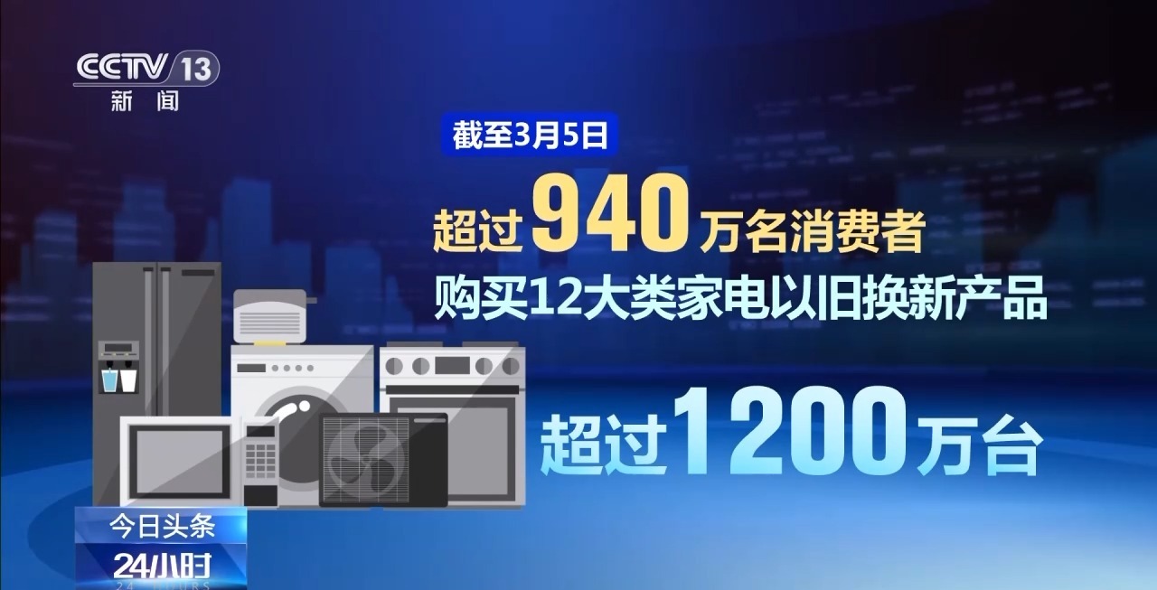 商務(wù)部數(shù)據(jù)顯示,截至3月5日,超過(guò)940萬(wàn)名消費(fèi)者購(gòu)買12大類家電以舊換新產(chǎn)品超過(guò)1200萬(wàn)臺(tái),已有超過(guò)3400萬(wàn)名消費(fèi)者申請(qǐng)了超過(guò)4200萬(wàn)件手機(jī)等數(shù)碼產(chǎn)品購(gòu)新補(bǔ)貼。