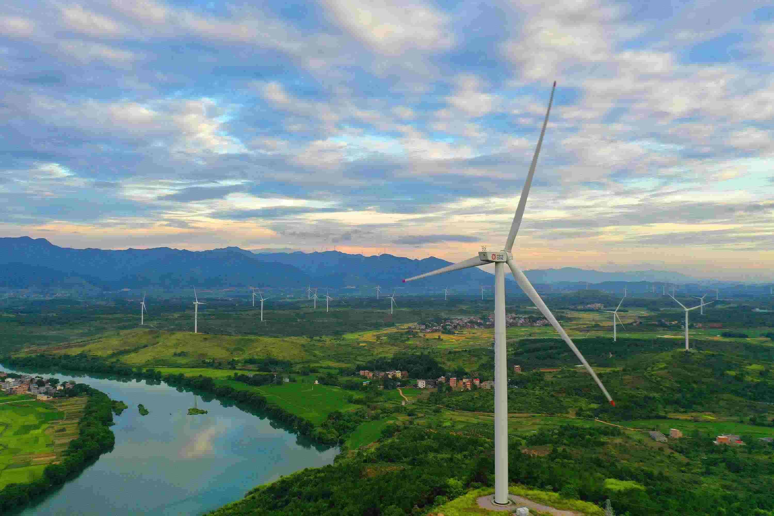△ 湖南省永州市的風力發(fā)電風車與藍天、綠水、田野交相輝映,構(gòu)成一幅美麗的生態(tài)畫卷。