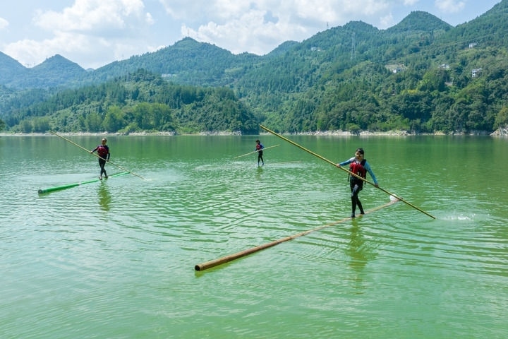 2023年9月15日,愛好者在湖北宣恩雙龍湖上練習(xí)“獨竹漂”(無人機(jī)照片)。新華社發(fā)(王法鈞攝)