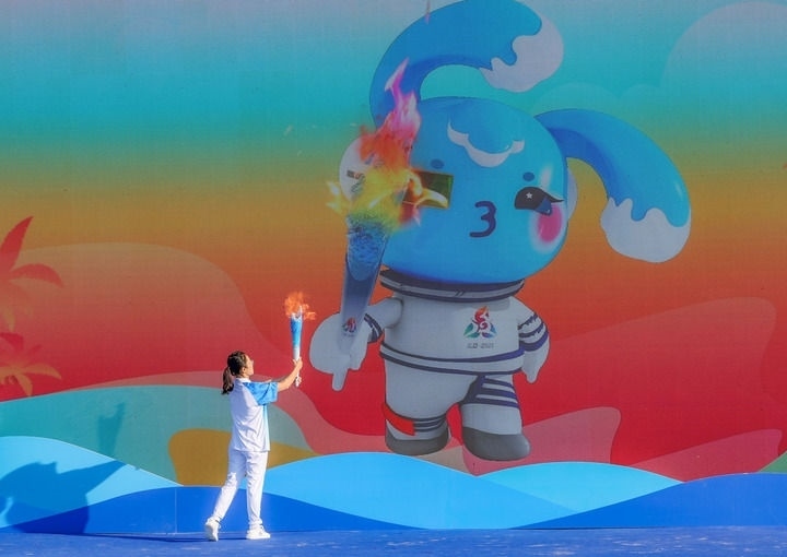 2024年11月17日,火炬手韓曉燕在三亞進(jìn)行的火炬實地傳遞活動起跑儀式上與本屆運動會吉祥物“吉貝”對接,點燃火炬。新華社記者 陳朔 攝