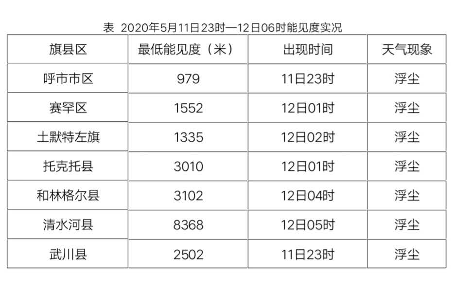 11日夜間風(fēng)力轉(zhuǎn)小,全呼市范圍出現(xiàn)浮塵天氣,能見度明顯轉(zhuǎn)差,最小能見度僅為979米,呼和浩特市一夜之間由青城變?yōu)椤包S城”。