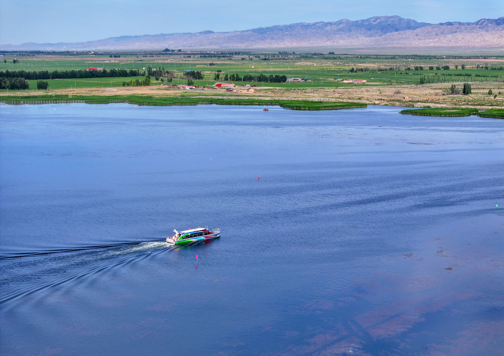 6月4日,游船行駛在烏拉特前旗烏梁素海湖面上(無人機(jī)照片)。新華社記者 連振 攝