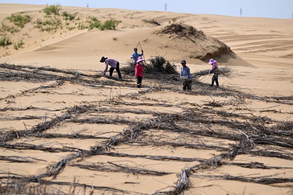 6月7日,在鄂爾多斯市達(dá)拉特旗境內(nèi)的庫布其沙漠,工人在治沙。新華社記者 李志鵬 攝