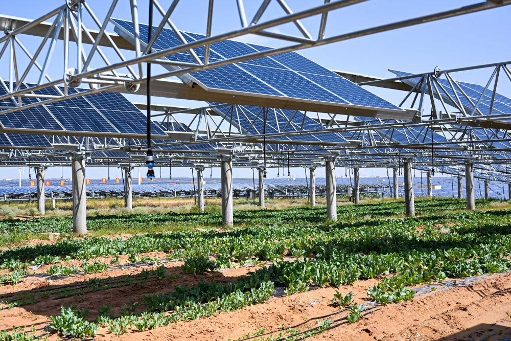 這是在庫布其沙漠里的蒙西基地庫布其200萬千瓦光伏治沙項(xiàng)目區(qū)光伏板下種植的農(nóng)作物(9月3日攝)。新華社記者 李志鵬 攝