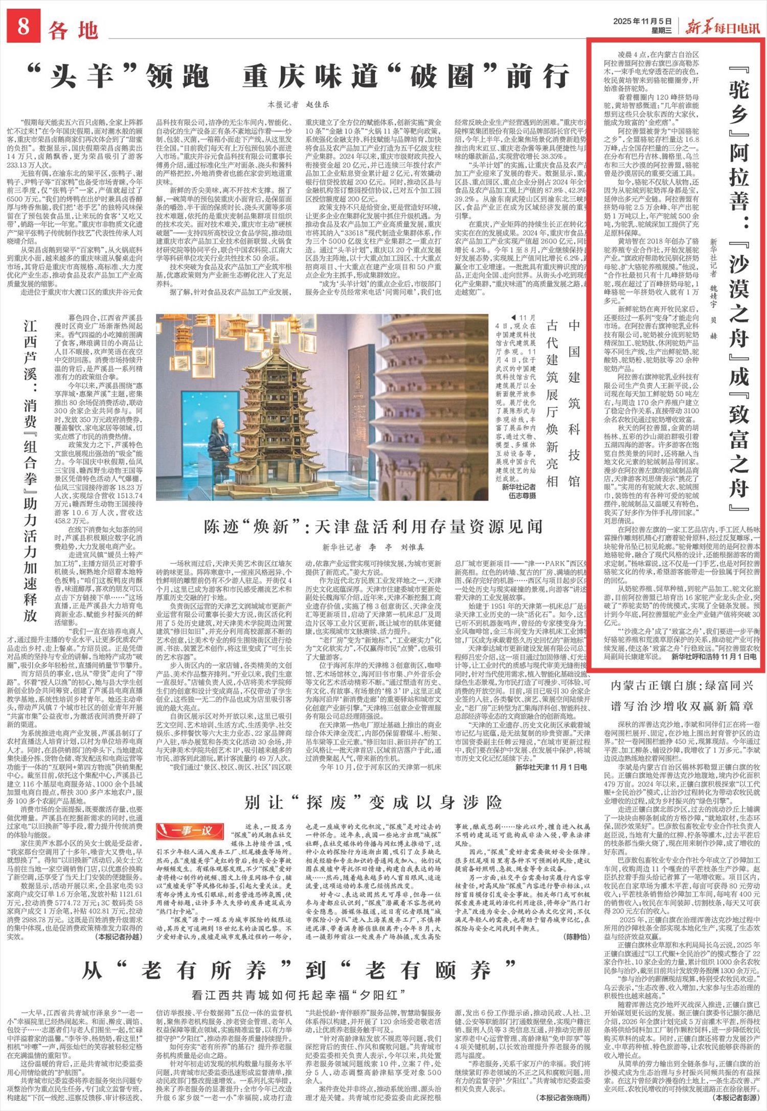 2025年11月5日,《新華每日電訊》第8版刊發(fā)題為《“駝鄉(xiāng)”阿拉善:“沙漠之舟”成“致富之舟”》的文章,報道了阿拉善盟被譽為“中國駱駝之鄉(xiāng)”,駱駝存欄量達16.8萬峰,占全國存欄量的三分之一。預計到今年底,阿拉善盟駝產業(yè)全產業(yè)鏈產值將突破30億元。