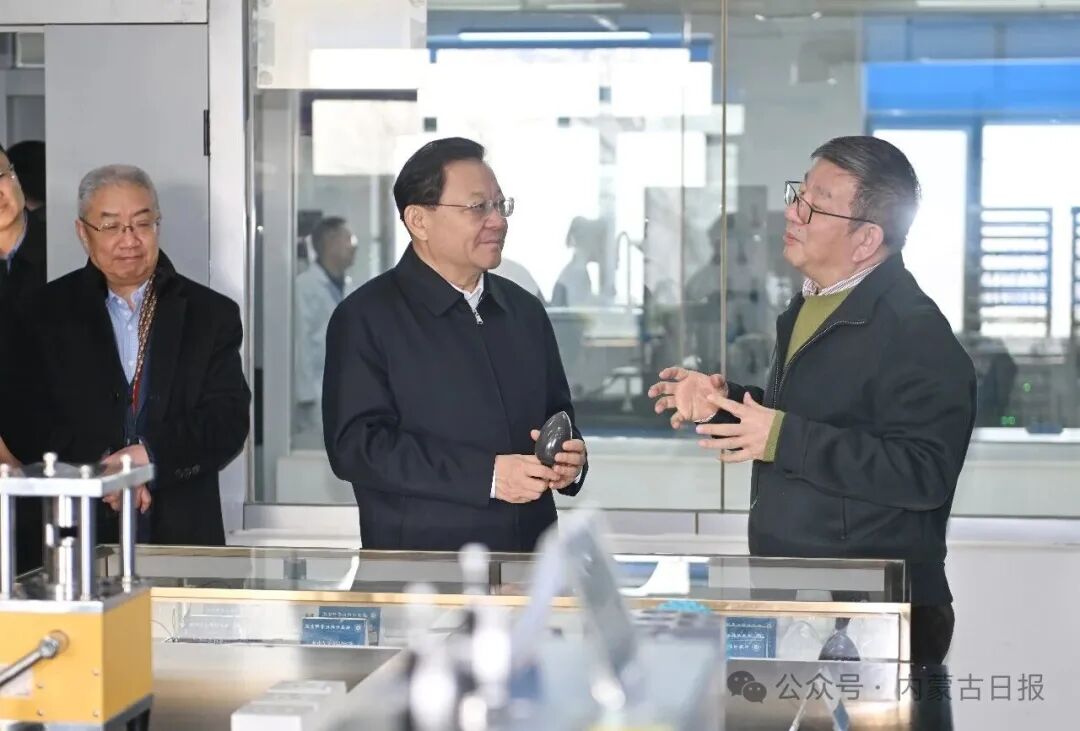 12月16日,自治區(qū)黨委書(shū)記王偉中走進(jìn)功能介孔材料實(shí)驗(yàn)室,認(rèn)真聽(tīng)取高寒地區(qū)電池儲(chǔ)能系統(tǒng)研發(fā)等進(jìn)展情況介紹。草原云·內(nèi)蒙古新聞網(wǎng)記者 馬建兵 攝