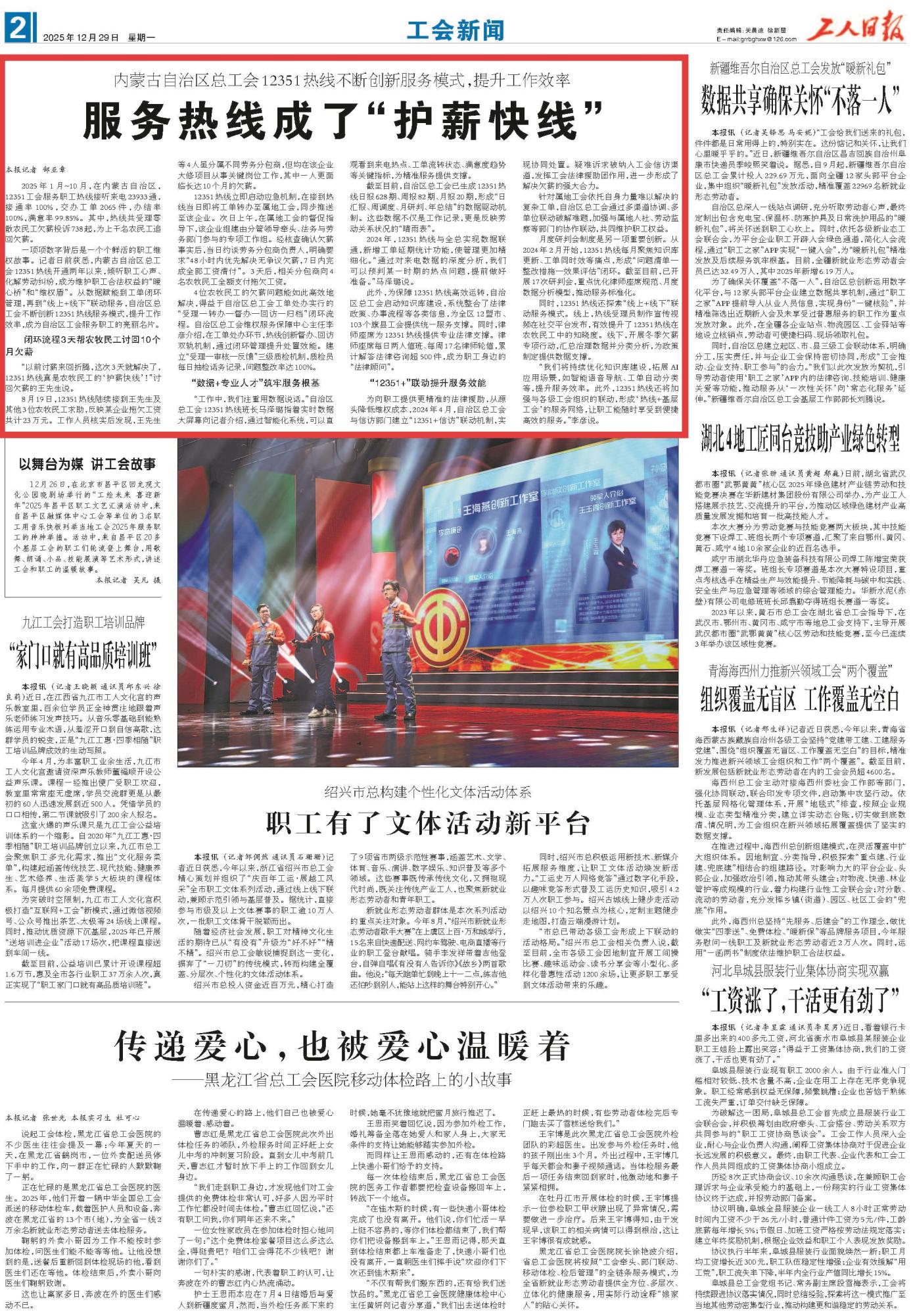 2025年12月29日,《工人日?qǐng)?bào)》第2版刊發(fā)題為《服務(wù)熱線(xiàn)成了“護(hù)薪快線(xiàn)”》的文章,報(bào)道了內(nèi)蒙古自治區(qū)總工會(huì)12351熱線(xiàn)開(kāi)通兩年以來(lái),傾聽(tīng)職工心聲、化解勞動(dòng)糾紛,成為維護(hù)職工合法權(quán)益的“暖心橋”和“維權(quán)盾”。其中,熱線(xiàn)共受理零散農(nóng)民工欠薪投訴738起,為上千名農(nóng)民工追回欠薪。