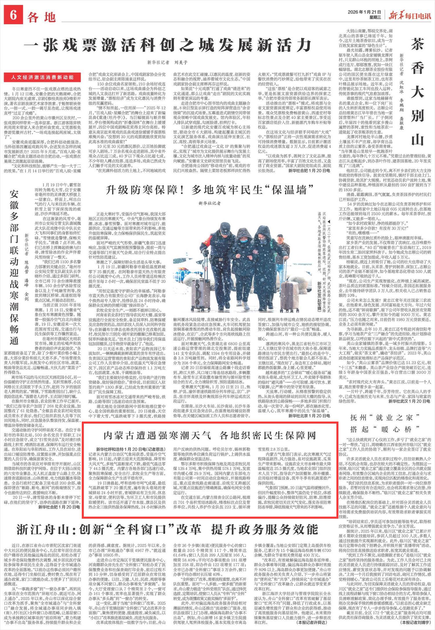 2026年1月21日《新華每日電訊》第6版刊發(fā)了《內蒙古遭遇強寒潮天氣 各地織密民生保障網》的文章,報道了內蒙古迎來大范圍降溫、降雪和大風天氣,多地氣溫斷崖式下跌,最低氣溫達零下44.5攝氏度。各地各部門迅速行動,聚焦防寒保暖、安全出行、農牧業(yè)生產等方面,全力保障群眾生產生活平穩(wěn)有序。