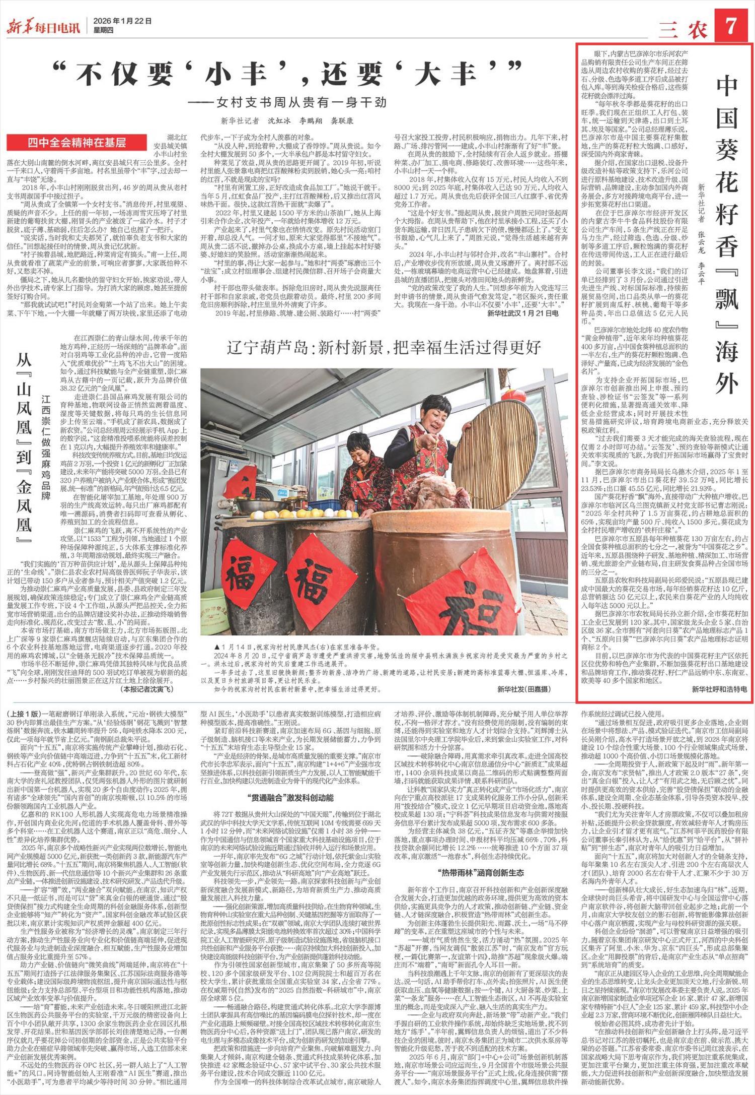 2026年1月22日,《新華每日電訊》第7版刊發(fā)題為《中國(guó)葵花籽香“飄”海外》一文,報(bào)道了巴彥淖爾市年均種植葵花400多萬(wàn)畝,生產(chǎn)的葵花籽顆粒飽滿(mǎn)、色澤好、產(chǎn)量高,目前,以巴彥淖爾市為代表的中國(guó)葵花籽主產(chǎn)區(qū)依托區(qū)位優(yōu)勢(shì)和特色產(chǎn)業(yè)集群,推動(dòng)葵花籽、籽仁產(chǎn)品遠(yuǎn)銷(xiāo)中東、東南亞、歐美等40多個(gè)國(guó)家和地區(qū)。