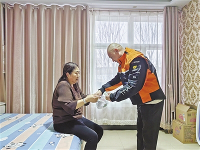 快遞員為社區(qū)居民上門送藥。(化德縣委社會(huì)工作部供圖)