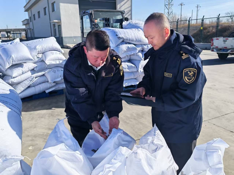 集寧海關(guān)關(guān)員對出口葵花籽進(jìn)行現(xiàn)場查驗
