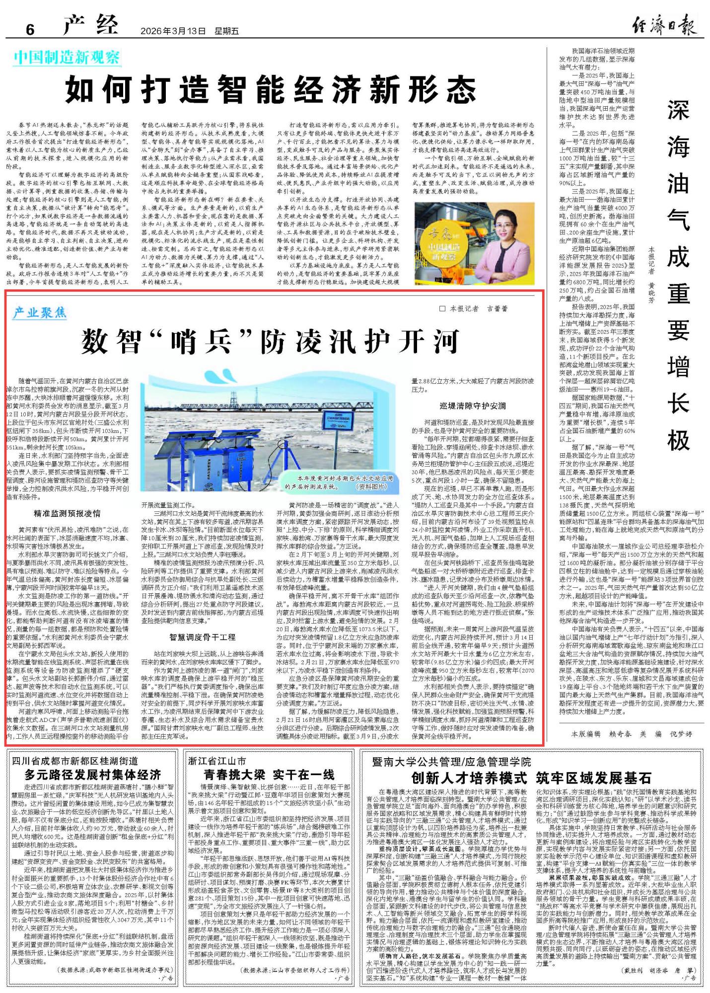 2026年3月13日《經(jīng)濟日報》第6版刊發(fā)了《數(shù)智“哨兵”防凌汛護開河》的文章,報道了3 月 12 日,黃河內(nèi)蒙古河段呈分段開河狀態(tài),累計開河 551 公里,剩余封河 105 公里。今年寧蒙河段開河偏早,凌汛風(fēng)險突出,水利部門通過精準監(jiān)測預(yù)報、智慧調(diào)度骨干水庫、啟用應(yīng)急分洪區(qū)、開展全方位巡堤清障等舉措,全力保障開河平穩(wěn)。預(yù)計 3 月 14 日前后內(nèi)蒙古河段全線開通,各項防凌工作正有序推進。