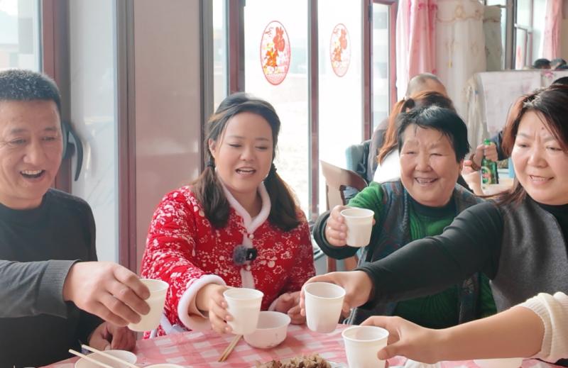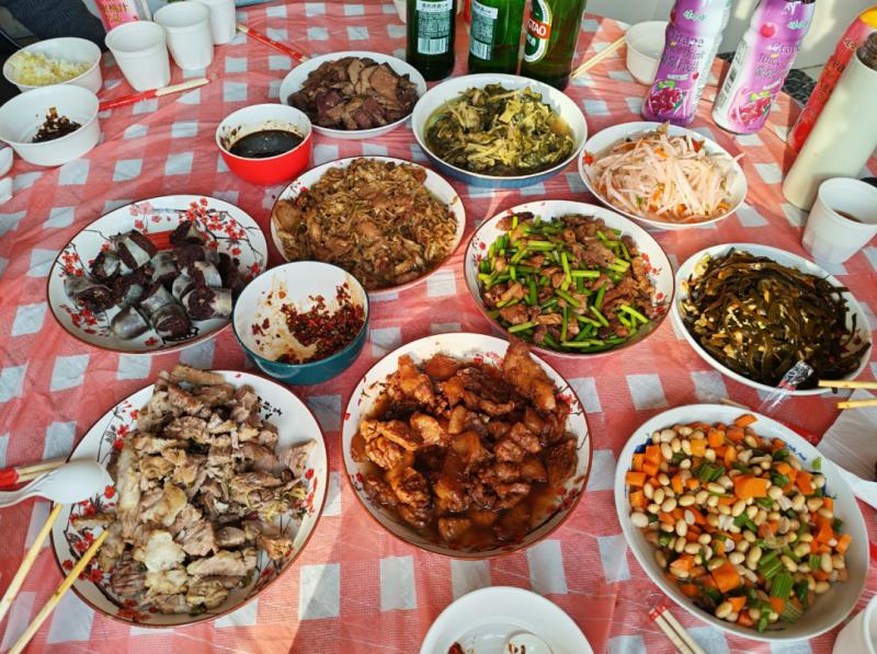 忙活了一上午,紅白相間的桌布上各類菜品早已擺得滿滿當當,除了位居主位的殺豬菜,還多了許多“衍生作品”:醬燜肉、汆白肉、蒜苔炒肉、酸菜炒肉、涼拌豬肝、豬血腸、涼拌海帶條、芥菜絲……圍坐一圈的不止家人,還有左鄰右舍。無需主人過多招呼,筷子便紛紛探向鍋中。窗外寒風漸歇,霧氣也被陽光驅(qū)散,而在溫暖的屋子里,鍋氣蒸騰,模糊了窗上的冰花,也潤濕了每一雙帶著笑意的眼睛。這不僅僅是一頓飯,更是鄉(xiāng)里鄉(xiāng)親們對生活最熱烈的擁抱?! ?/p>